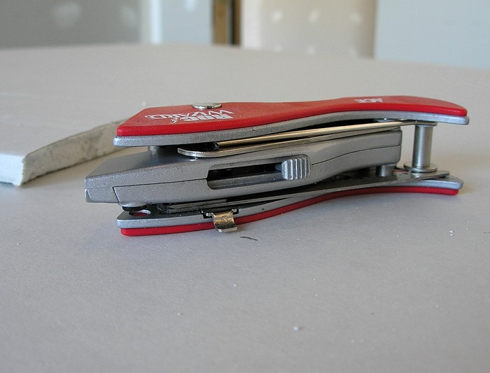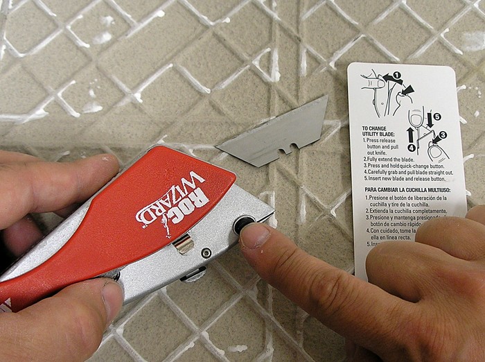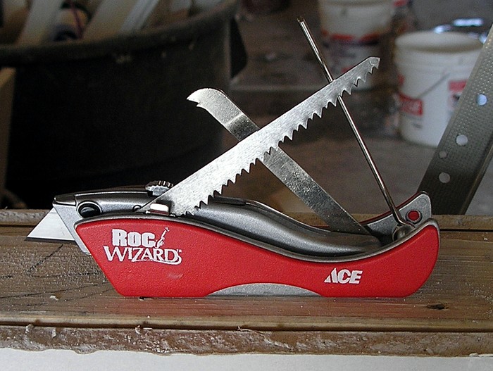 - Primary blade is a standard utility knife, including the entire full-sized handle. The razor blade itself is extended and retracted using a locking push button.