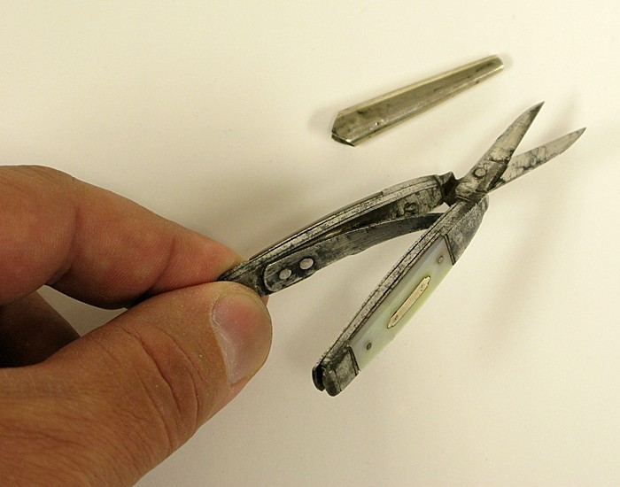 A nickel silver sleeve was included to hold the spring-loaded scissors in the closed position. (note that the knife blades can only be used practically when the scissors are closed) This sleeve has been lost to the ages on most examples found today.