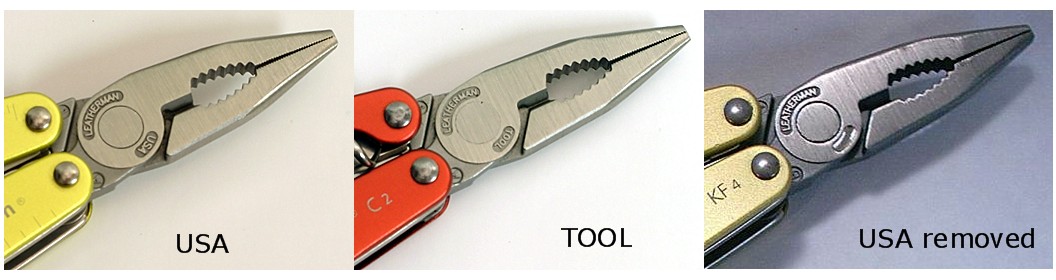 • Early Juice tools had LEATHERMAN and USA cast into both sides of the plier head. After Leatherman lost the infamous Colgan -v- Leatherman lawsuit in California, all models including the Juice tools were cast with LEATHERMAN and TOOL. A transitionary stage occured in between however as there were apparently a large number of the pre-lawsuit pliers already produced. The solution was to remove the forbidden USA markings with a milling cutter. (see photos below)