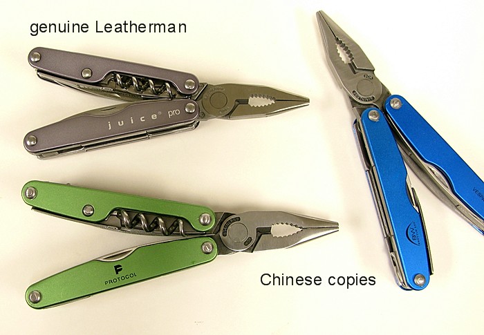 • Knockoff artists from Asia have gone to great lengths to copy the Juice tools. Pliers, handles, blades, and appearance are all painstakingly duplicated, clearly with an intent to mislead the consumer. Several Juice models (perhaps all of them) have a fake counterpart. Care must be taken not to be fooled when shopping for genuine Leatherman products over the internet.
