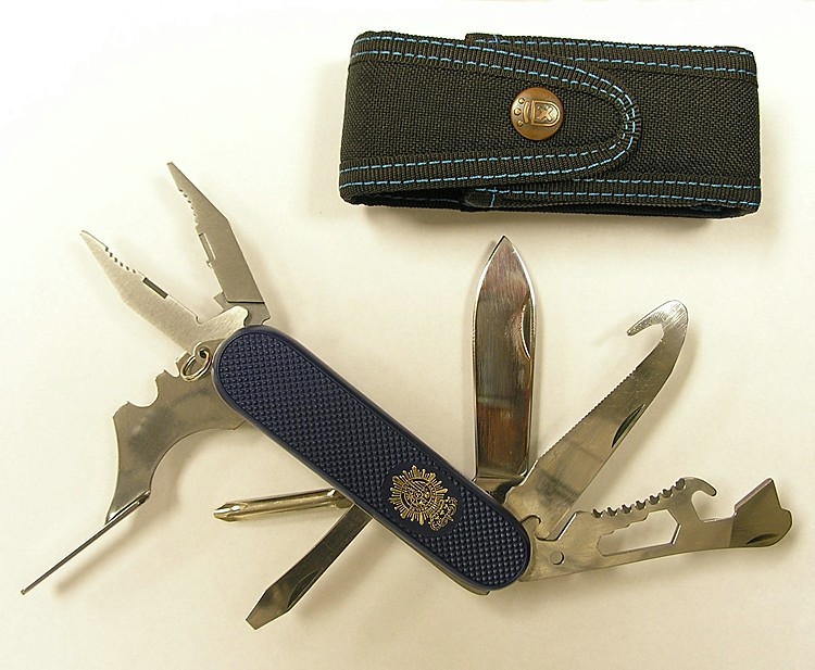 The Police Knife uses the swiss-army-knife style layered construction approach. A selection of standard Aitor blades and tools are arranged in a fashion that would appeal to law enforcement and other professionals. The large folding plier makes this device as much a "tool" as a "knife," gaining it entry into the Multitool Encyclopedia. |